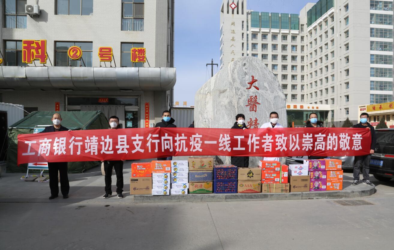 图为:工商银行靖边支行为我院捐赠食物、水果、牛奶等生活物资