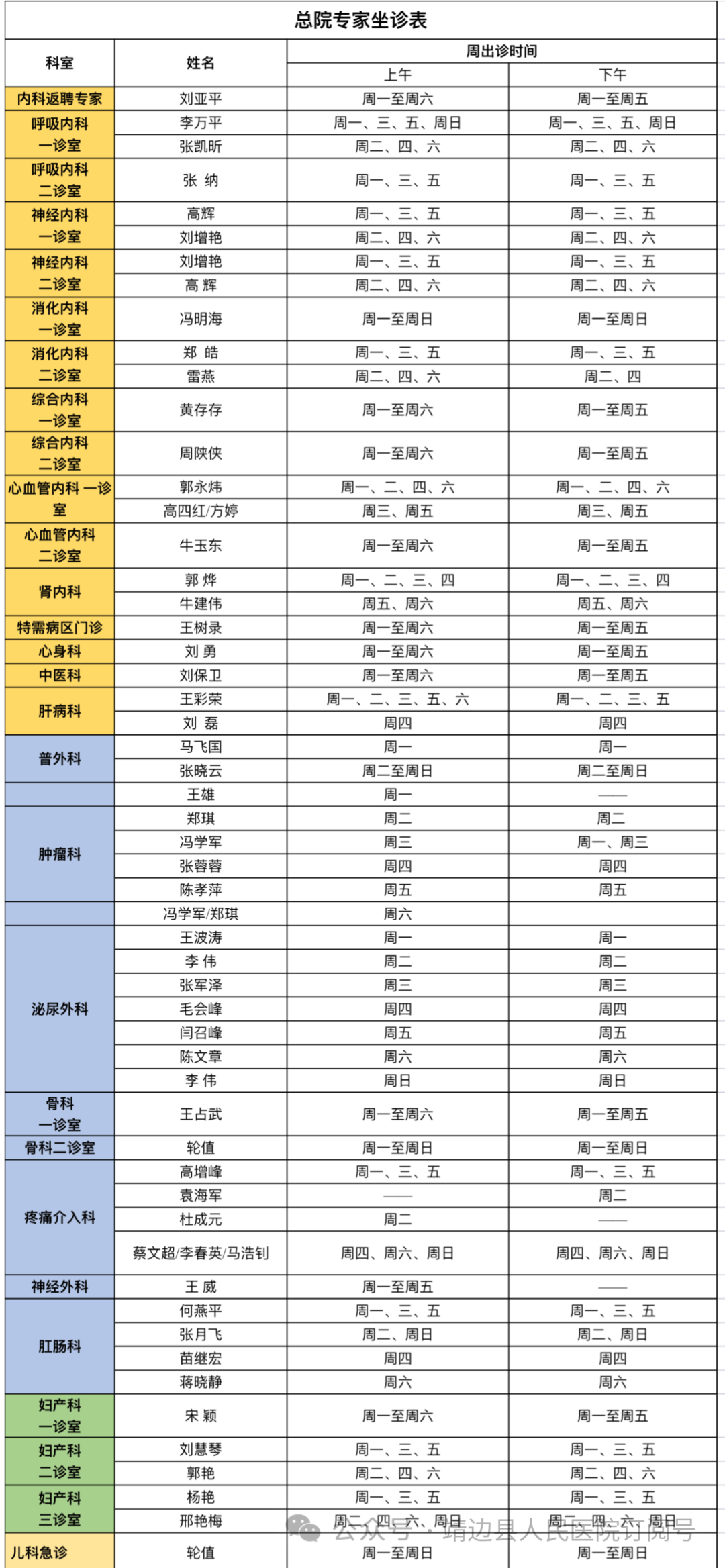 靖边县人民医院门诊专家出诊信息(1月8日—1月14日)