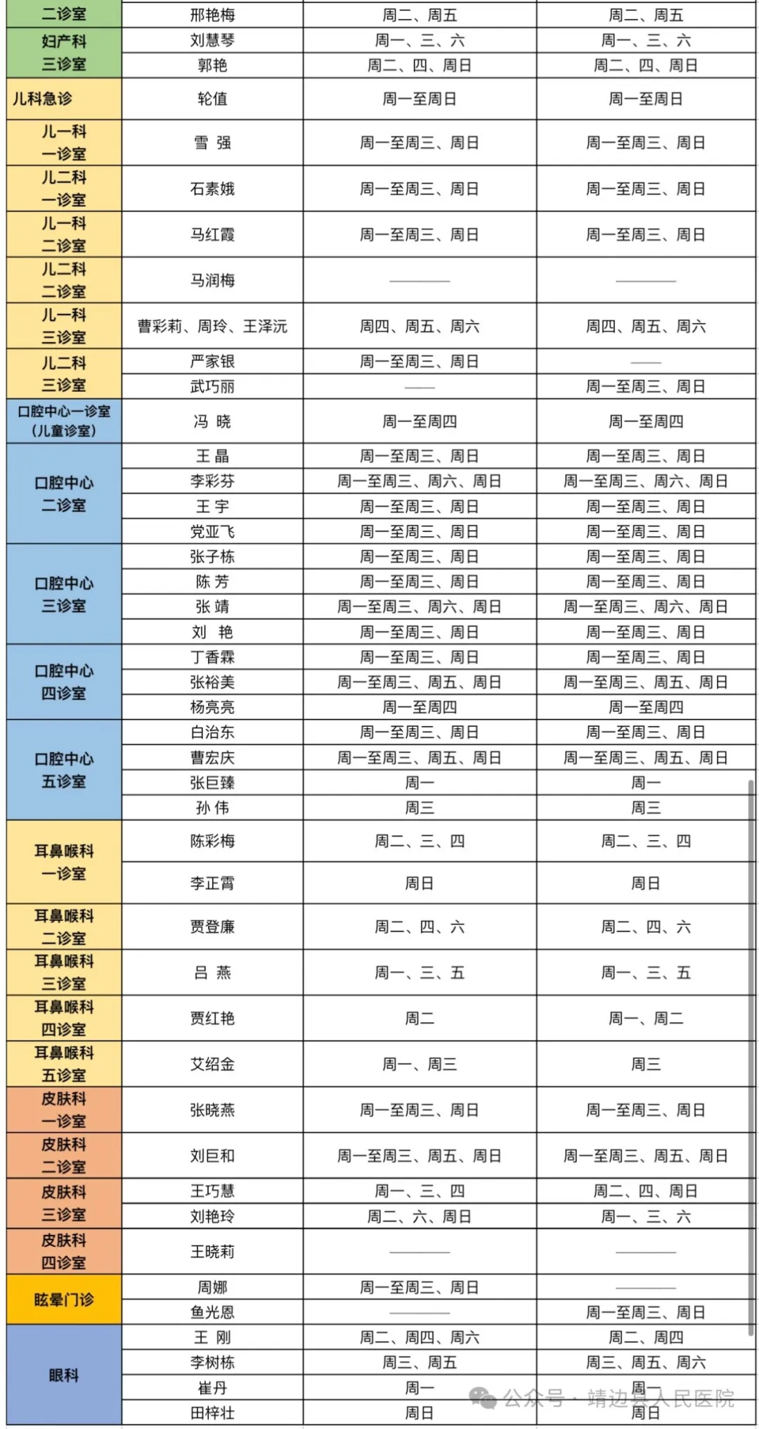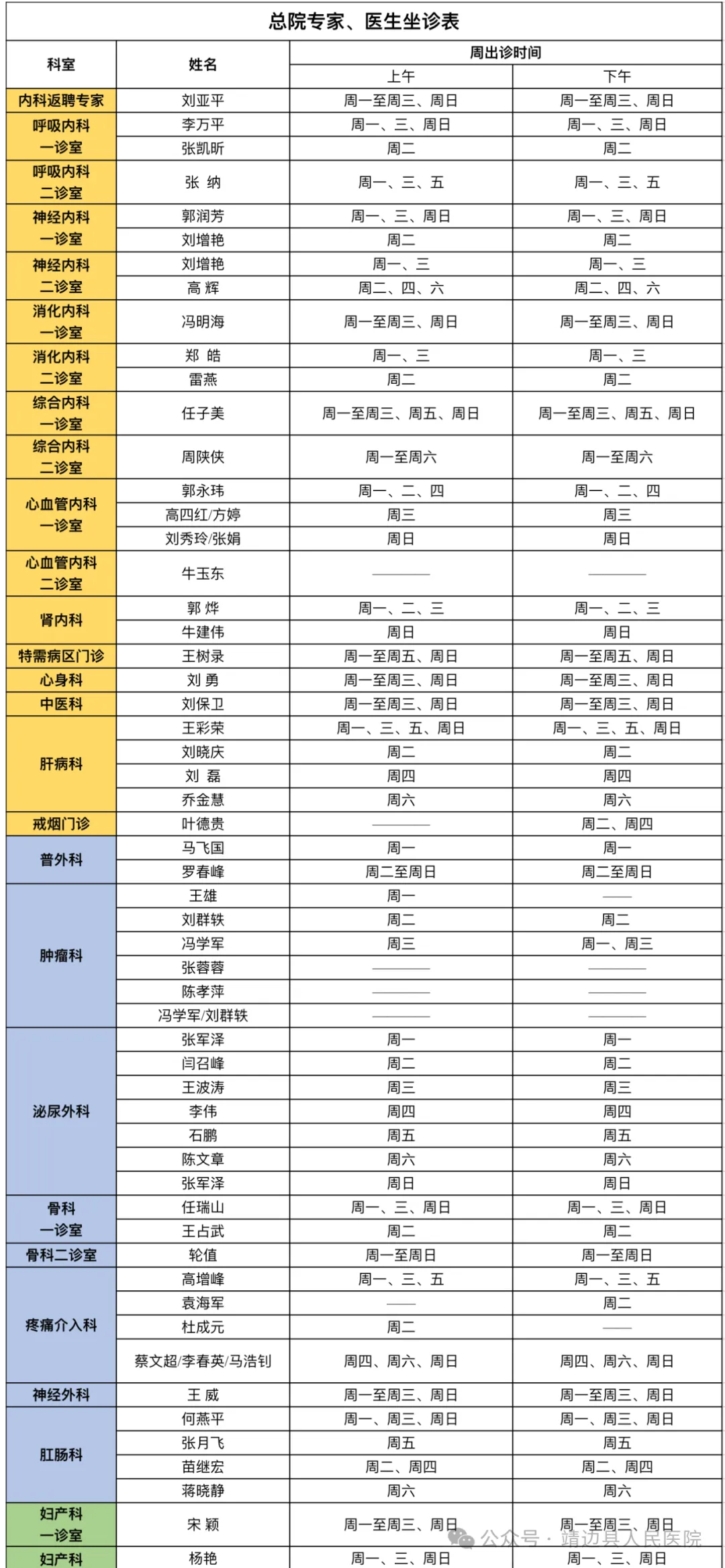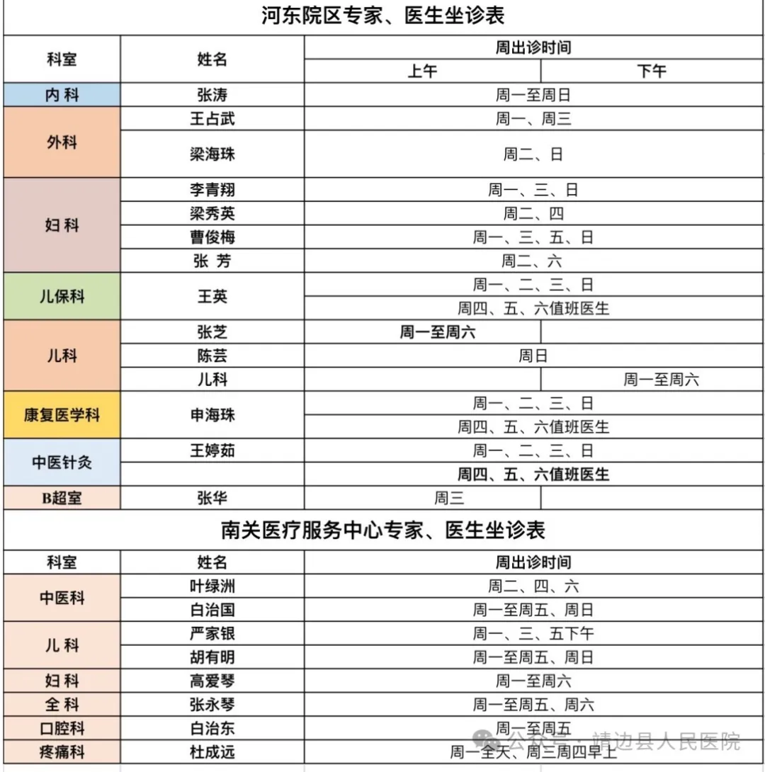靖边县人民医院门诊专家、医生出诊信息(4月1日—4月7日)
