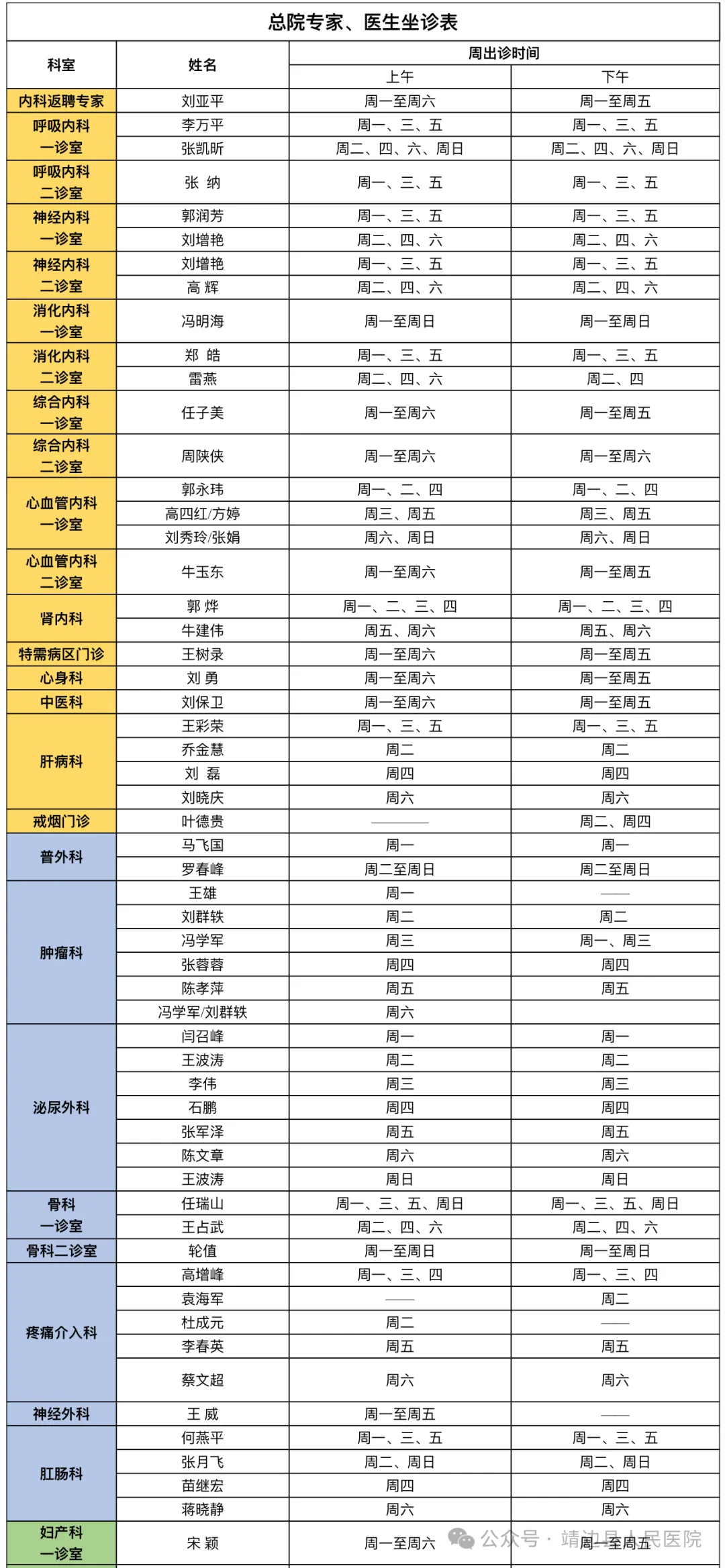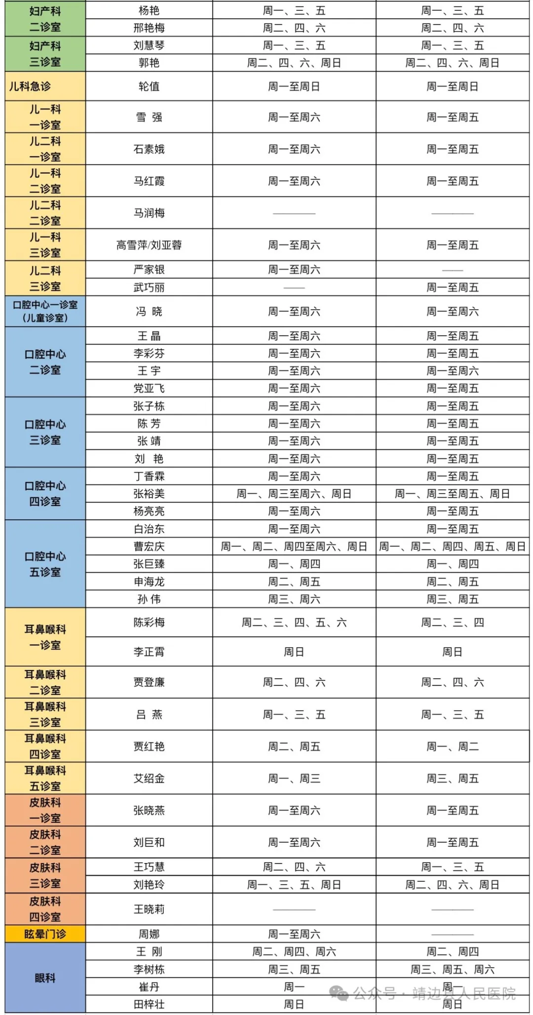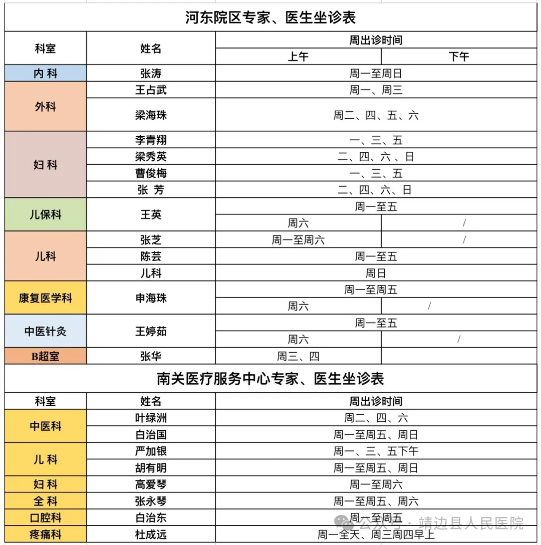 靖边县人民医院门诊专家、医生出诊信息(4月8日—4月14日)