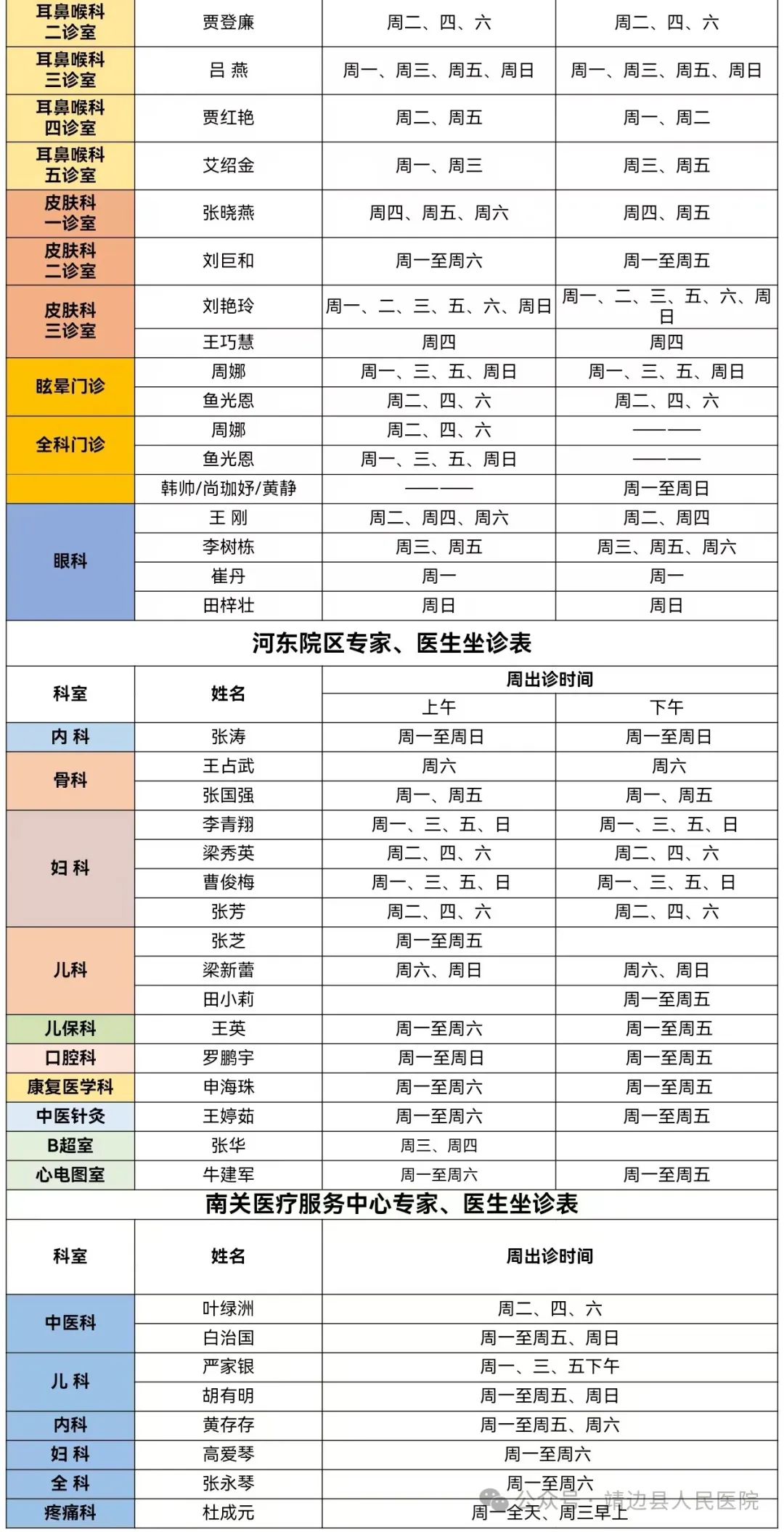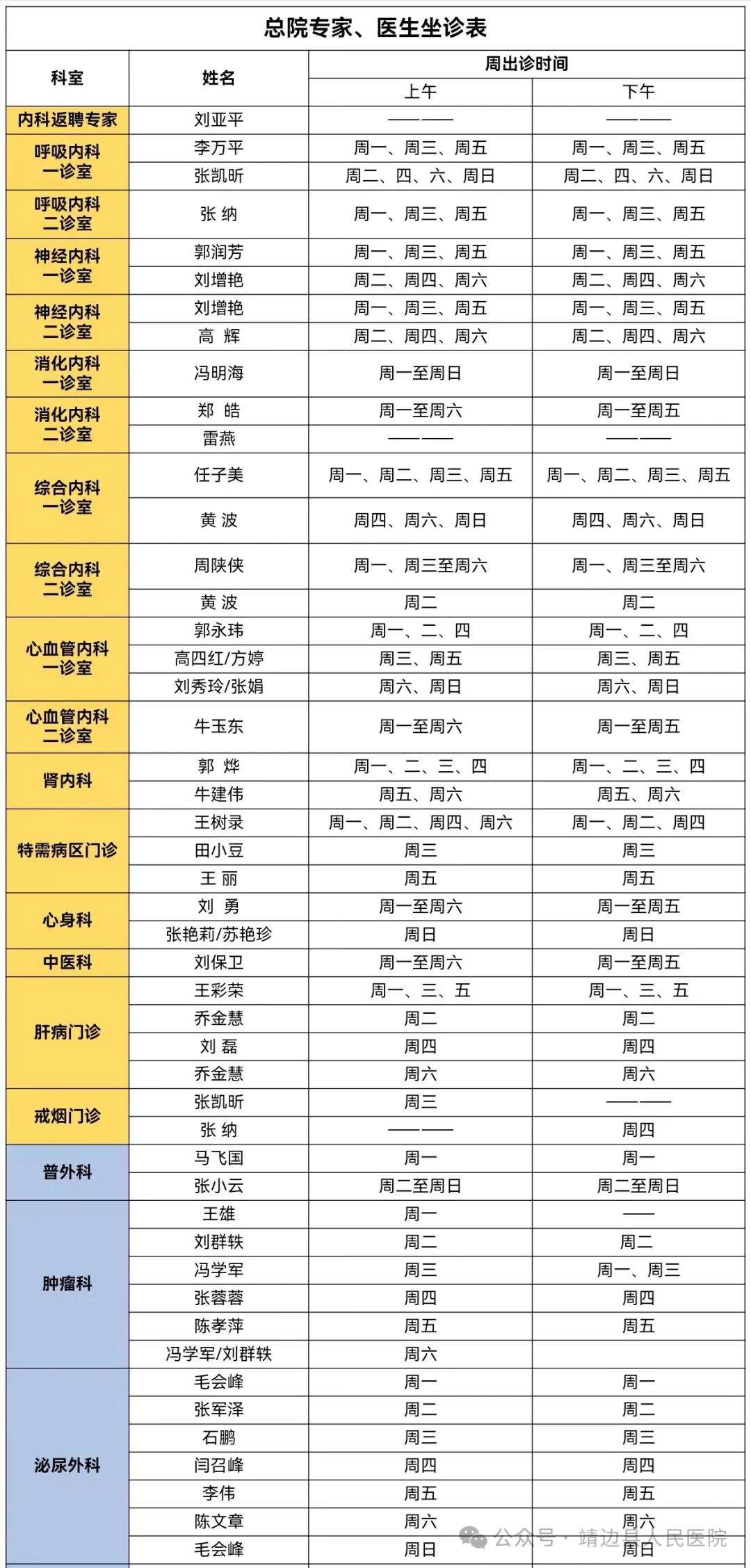 靖边县人民医院门诊专家、医生出诊信息(8月5日—8月11日)