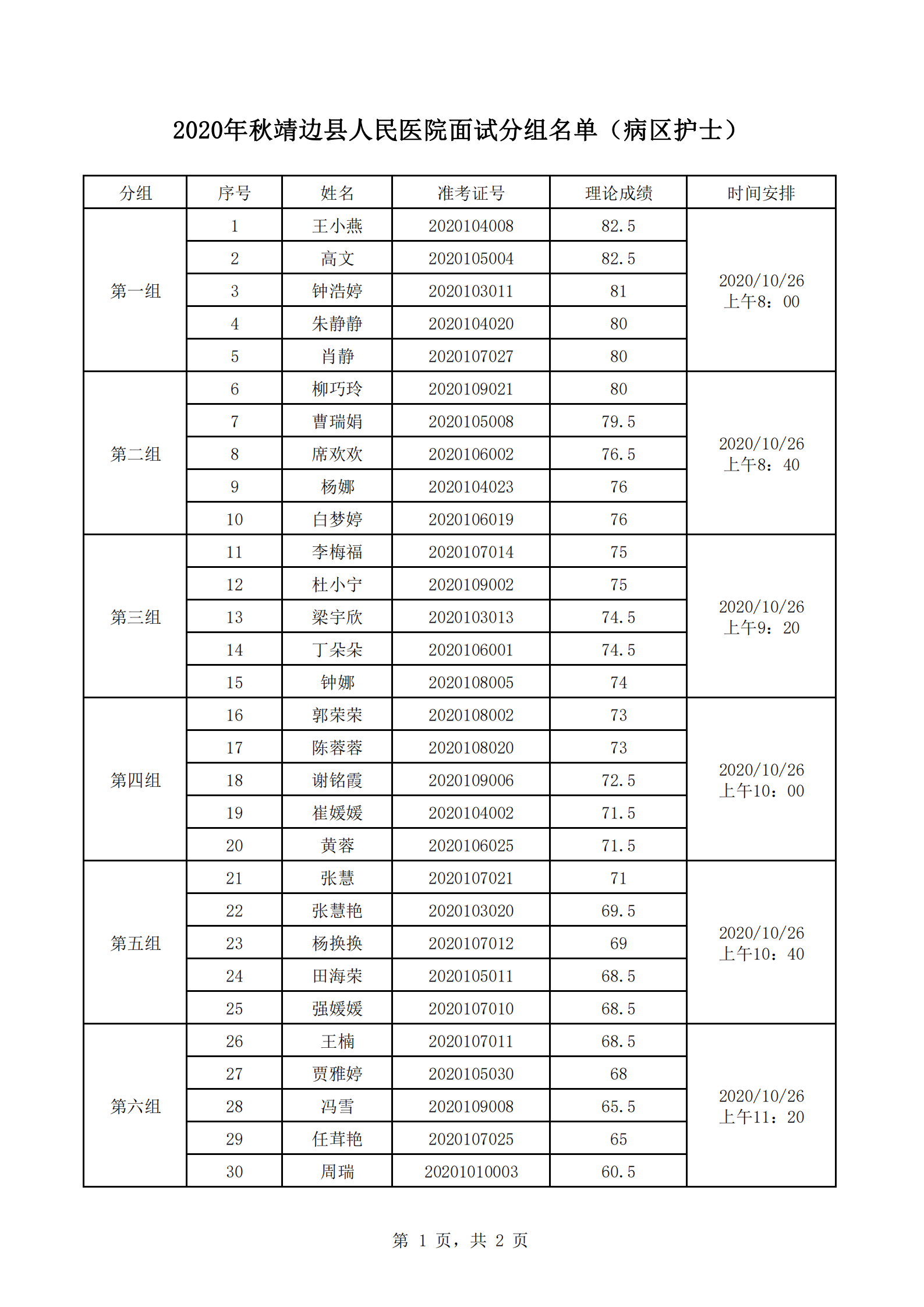 靖边县人民医院院内聘用病区护士参加面试人员及分组名单