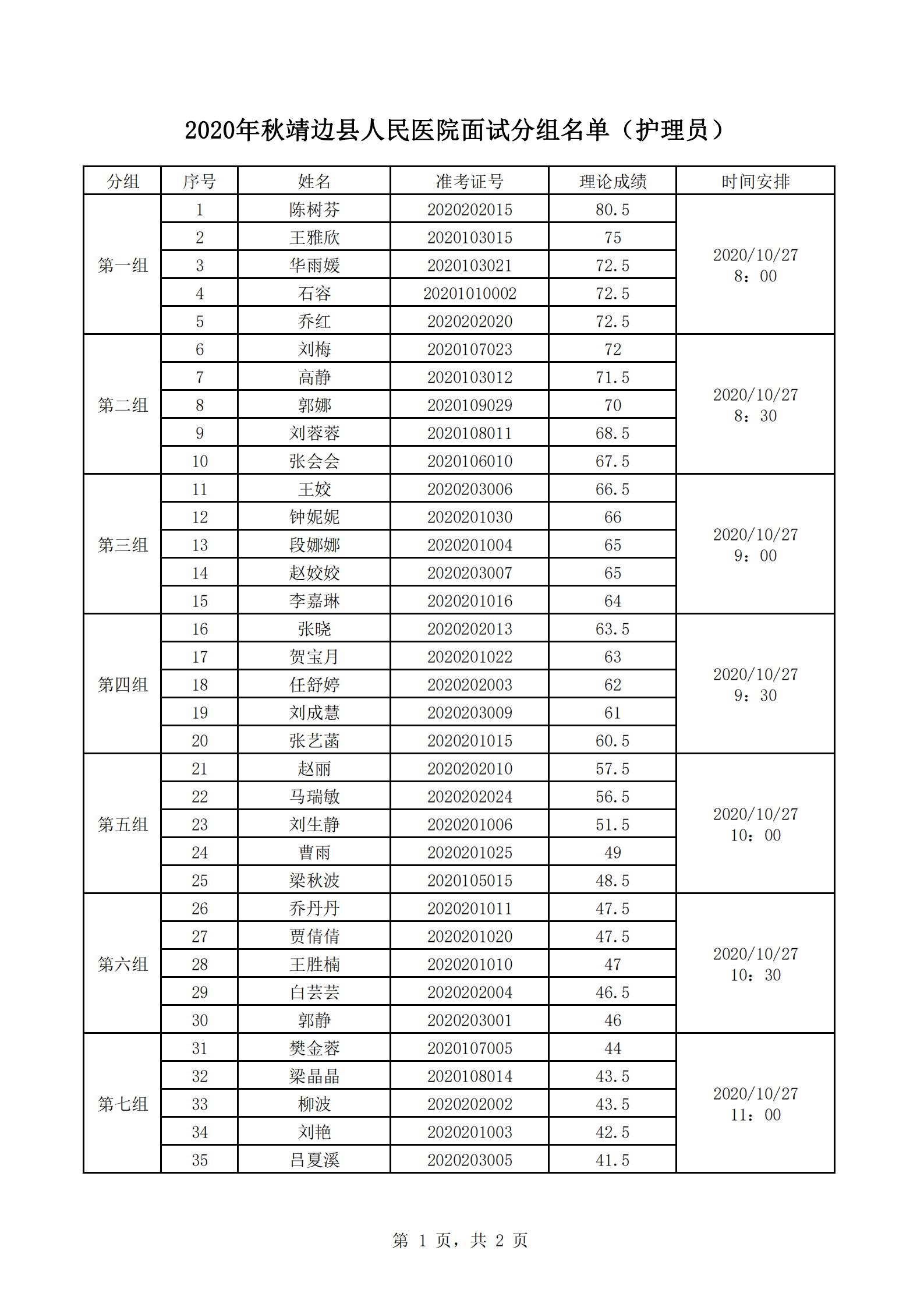 按照《靖边县人民医院院内聘用护理人员招聘公告》,病区护士应聘人员的笔试成绩由高到低按照1:1.4 的比例,护理员应聘人员的笔试成绩由高到低按照1:1.5 的比例确定参加面试人数。(五年一贯大专学历报考病区护士笔试上线人员,以护理员身份面试,不占用原30名护理员招聘计划)。现将靖边县人民医院院内聘用护理人员参加专业技能考核人员及分组名单公示如下: