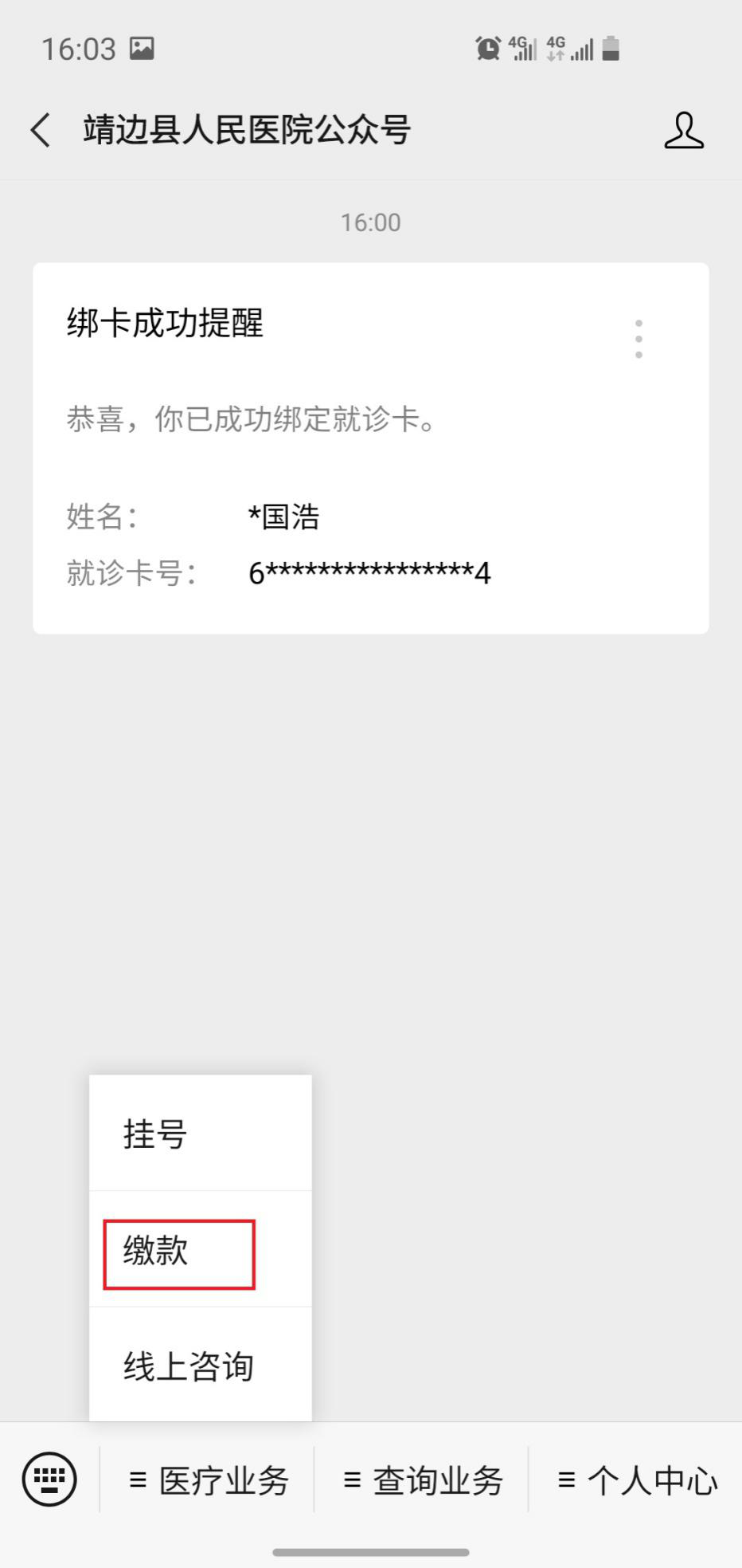 2 、关注靖边县人民医院公众号后,点击个人中心,进行绑卡。