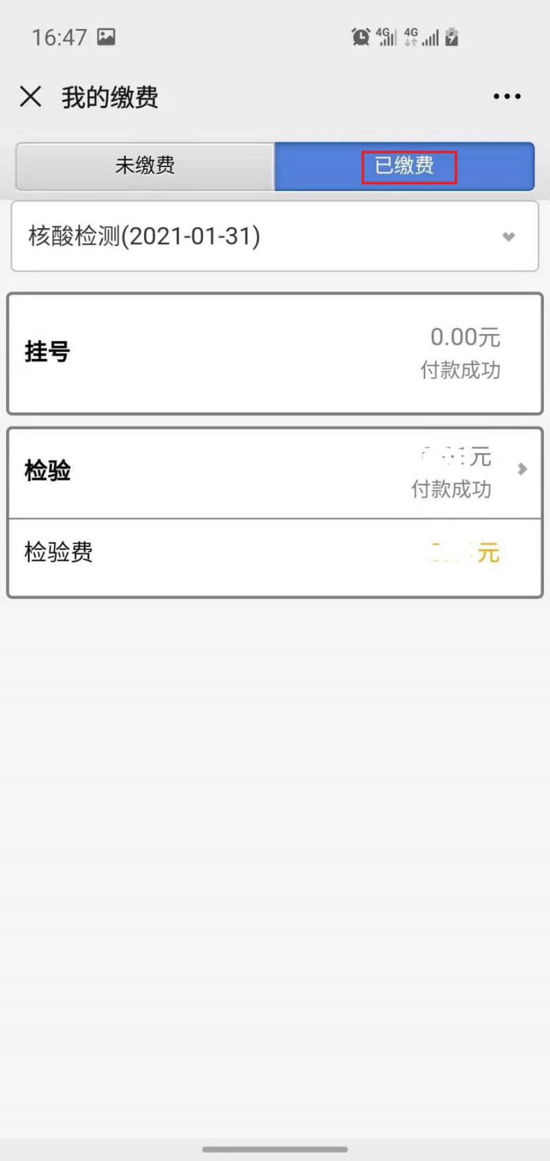 10、缴费成功后,点击已缴费,然后进入核酸检测付款成功页面。医院工作人员查看确认后,进行拭子采集。