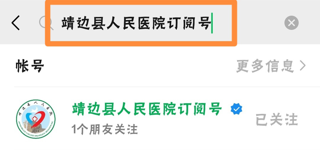 3.在搜索栏中输入“靖边县人民医院订阅号”