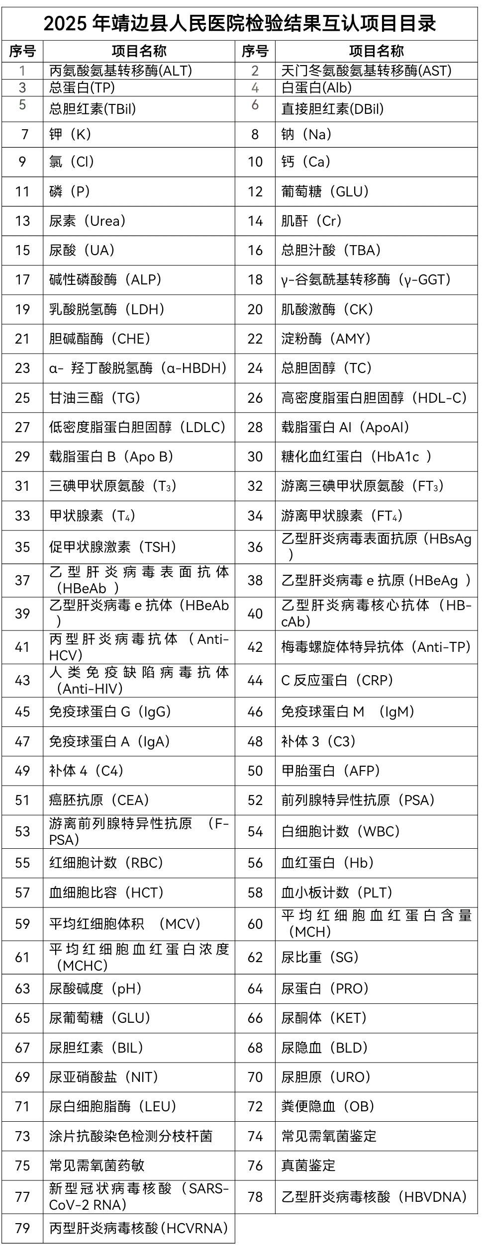 附件:2025年靖边县人民医院检验结果互认项目目录(79项)