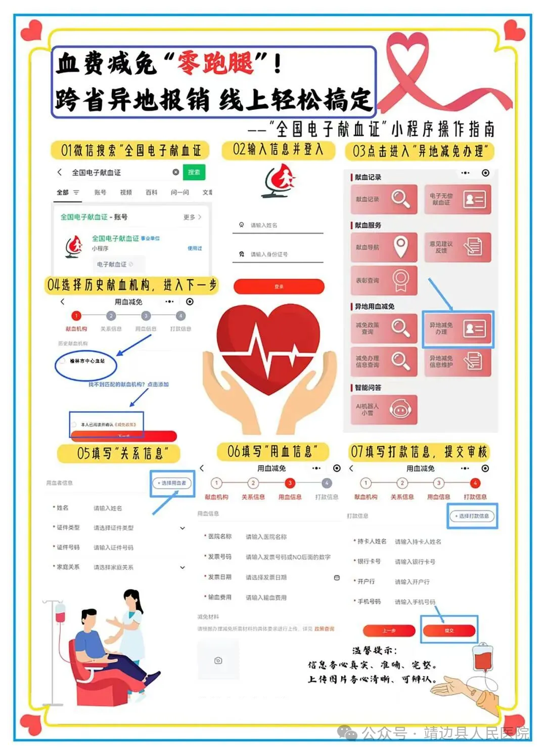 无偿献血者及其直系亲属(配偶、父母、子女)在临床用血后,只需在出院时携带好相关资料,前往医院专门设立的血费直报窗口,即可一站式完成血费报销。