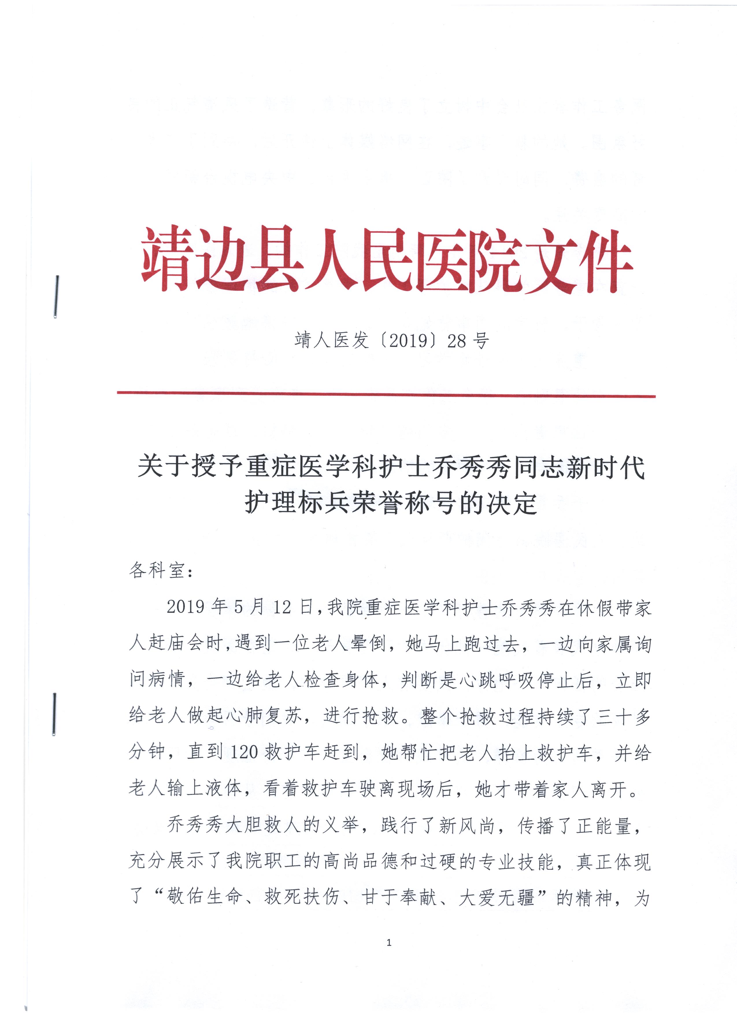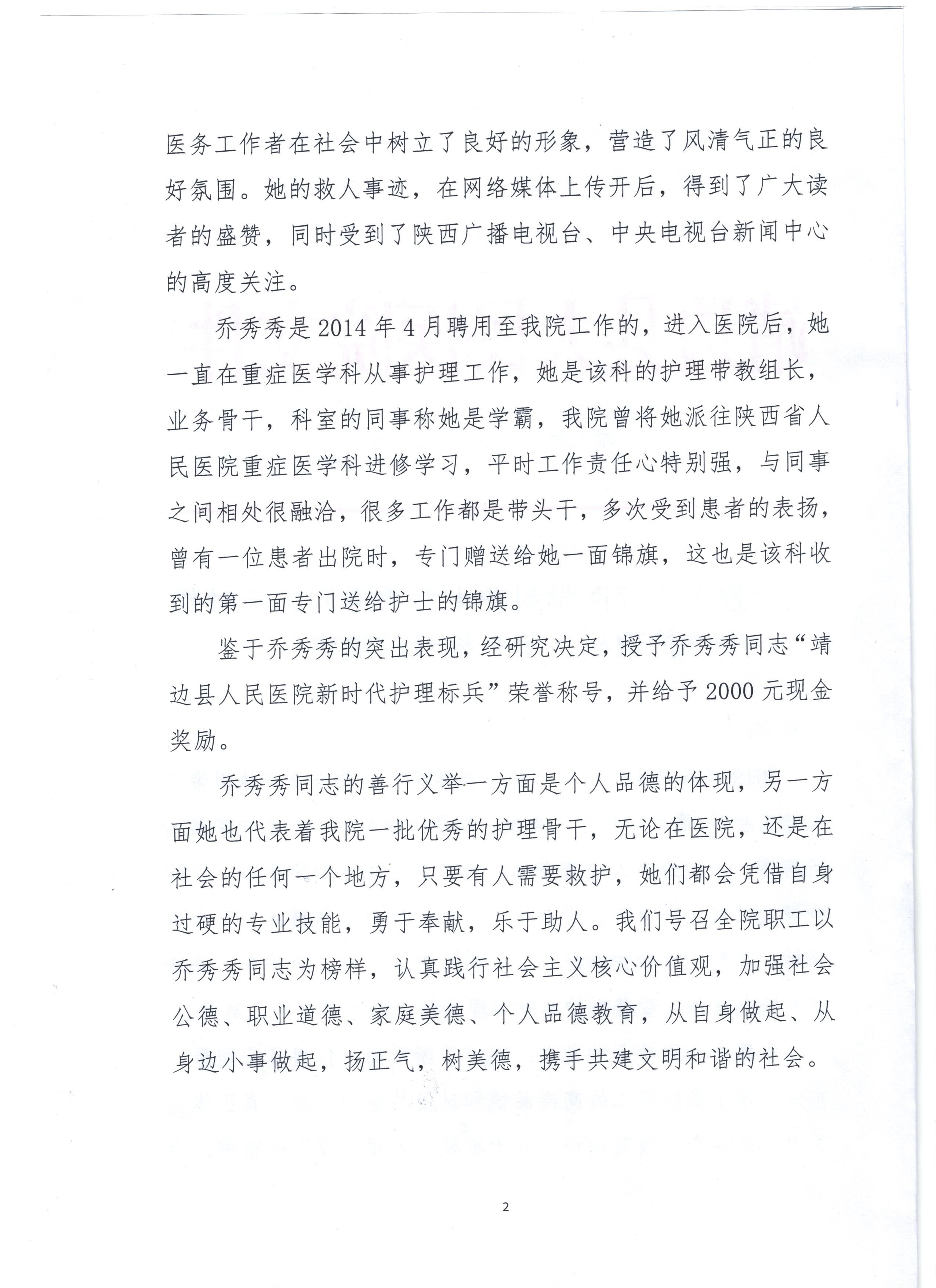 关于授予重症学科护士乔秀秀同志新时代护理标兵荣誉称号的决定