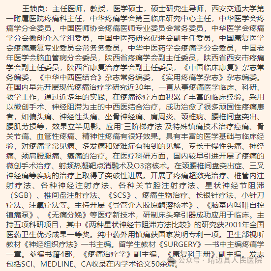 2024年3月23日,我院特邀西安交通大学第一附属医院疼痛科主任王锁良教授来我院坐诊、手术。需要就诊的患者请提前到我院门诊二楼外科门诊疼痛介入科诊室就诊、咨询。 联系电话: 蔡大夫:15591222302 李大夫:13992234110 高大夫:13571208383