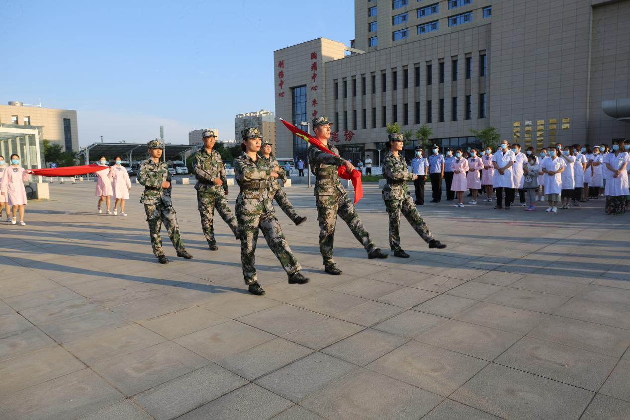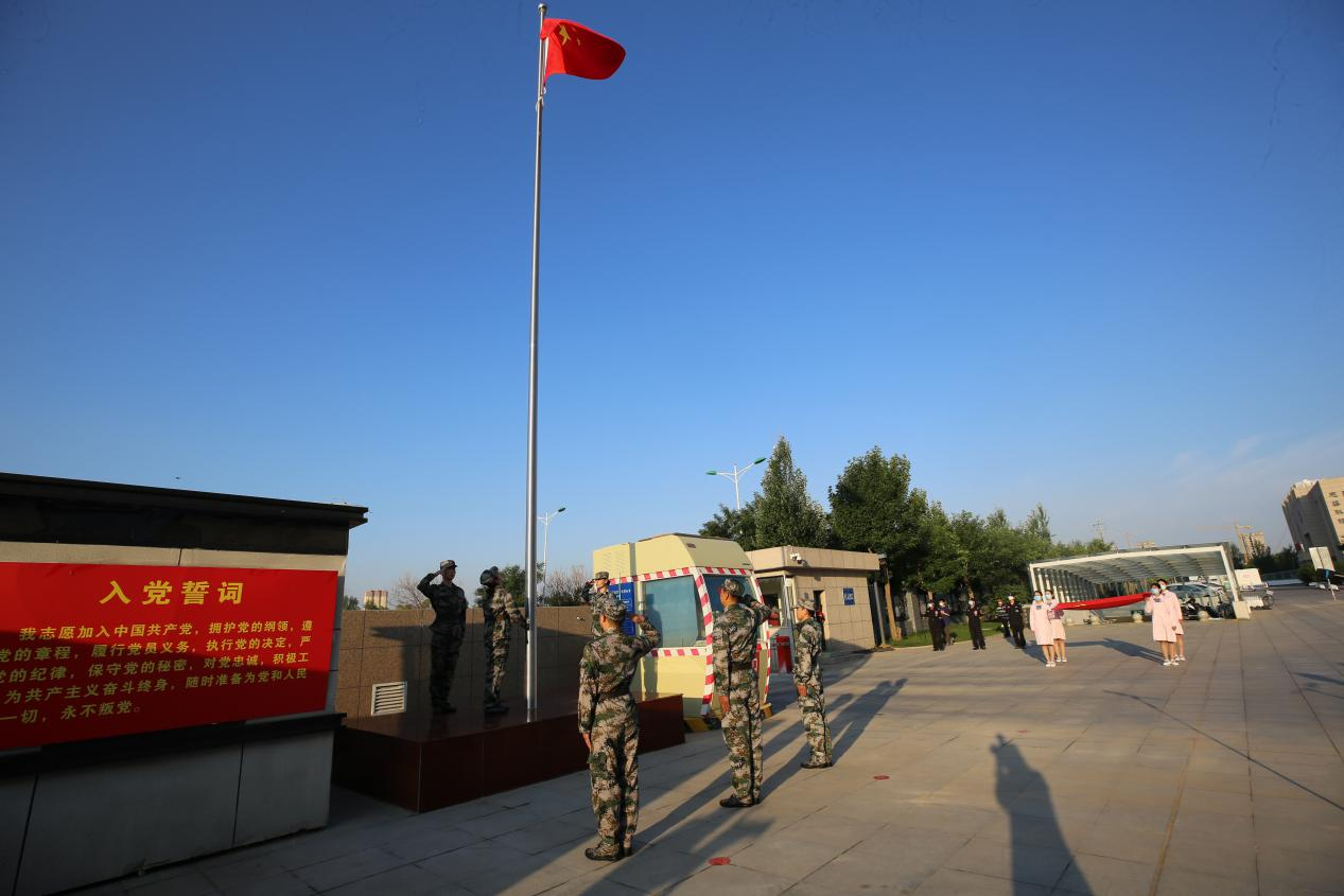 早上6:30,全体人员统一着装、精神饱满、列队整齐,5名护旗手和1名升旗手踏着整齐的步伐,以饱满的热情,护卫着五星红旗走向升旗台,伴随着庄严嘹亮的国歌声响彻医院上空,五星红旗冉冉升起,全体医务人员肃然而立,目光都凝望着徐徐升起的国旗,深情合唱国歌,歌声激荡在每个人的心中,深怀着对祖国无限的热爱和崇高的敬意。