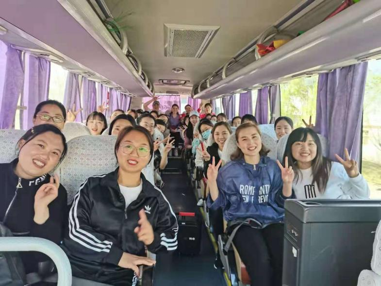每天早晨七点半,所有参加拓展训练的护士在院内集合,统一乘坐大巴车出发。在去往拓展训练的路上,护理部主任孙秀娥组织大家唱红歌,一首首耳熟能详的红歌在车厢内响起,充满了对祖国的赞颂之情,一路欢声笑语……