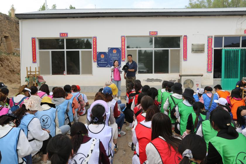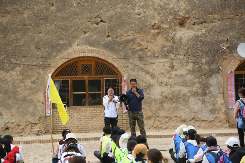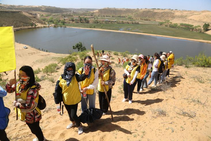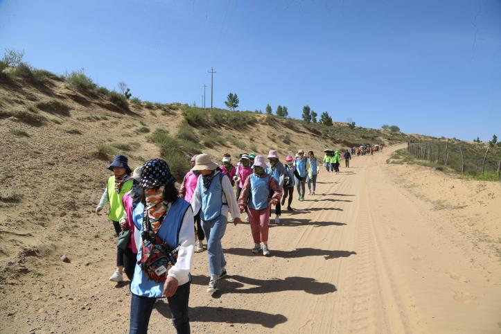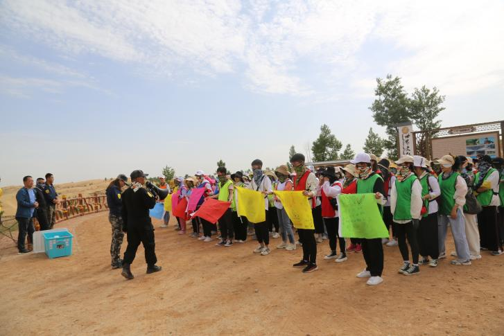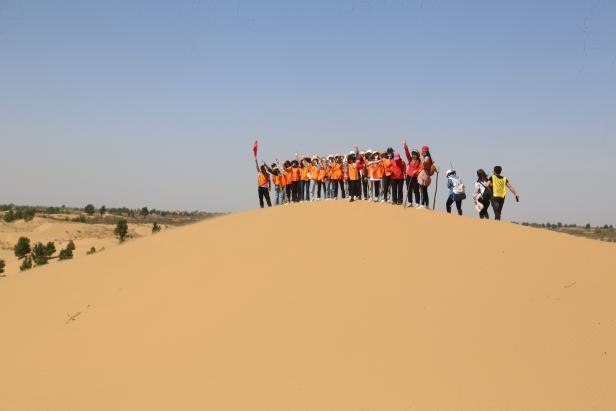到达目的地后,总教官对人员进行分队,每队按照要求在队旗上绘制会标、口号、编制队歌。由队长带队进行五公里徒步行走。在徒步的路程中大家要翻越沙漠,经过沙漠中 的小河和草地。在徒步的路上太阳炙烤着大地,气温达到三十多度,但没有人退缩,一路上大家被神奇的沙漠绿洲所吸引,相互拍照、相互鼓励、相互搀扶着一路前行,用了4个多小时到达营地。