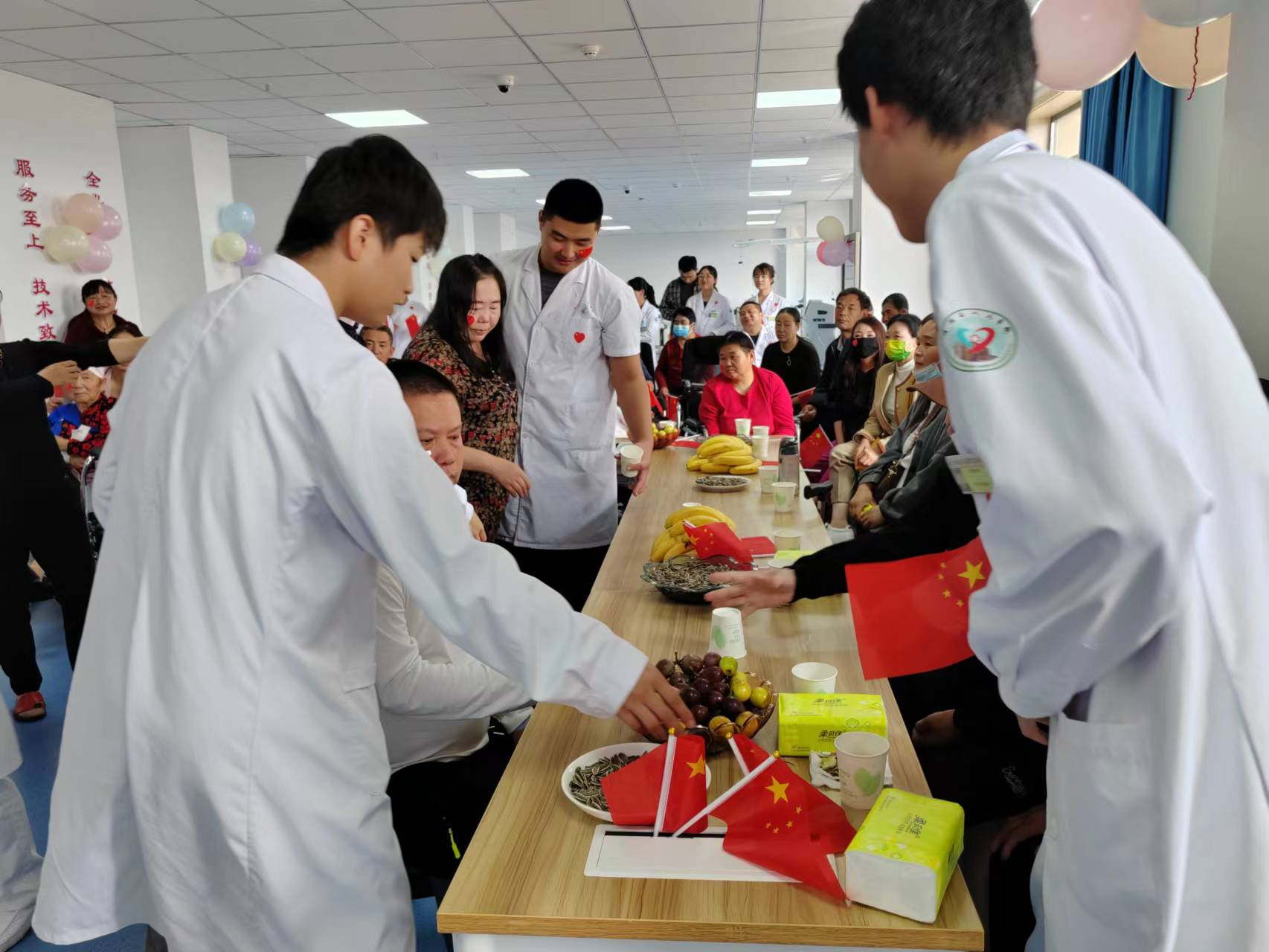 为增加活动的趣味性、娱乐性、竞争性,科室特意为患者及家属准备了新鲜的水果拼盘、瓜子等休闲食品。并安排了“抢杯子”、“快乐保龄球”和“踩气球”等游戏项目,还为游戏的胜出者分发了小礼品。