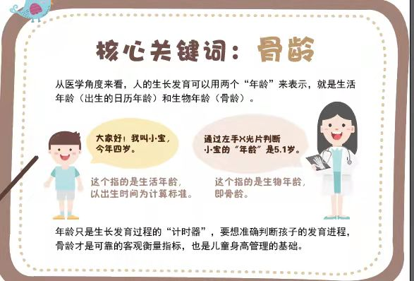 长高就像一场和骨骺闭合抢时间的赛跑,一旦骨骺闭合,身高也就定型了。一般来说,由于孩子的个体差异,所有孩子身高停止生长的年龄可能不同,但身高停止生长的骨龄却是基本相似的,男孩骨龄16岁,女孩骨龄14岁,只不过,每个孩子骨龄的生长速度不同而已。医生通过骨龄和身高的增长情况,分析孩子身高的生长速度,了解生长潜能和成年身高状况,从而制定科学的长高方案。总而言之,孩子开始身高管理的年龄越小,其身高增长的潜力和调整空间就越大,将来长成大高个儿的可能性才更大。