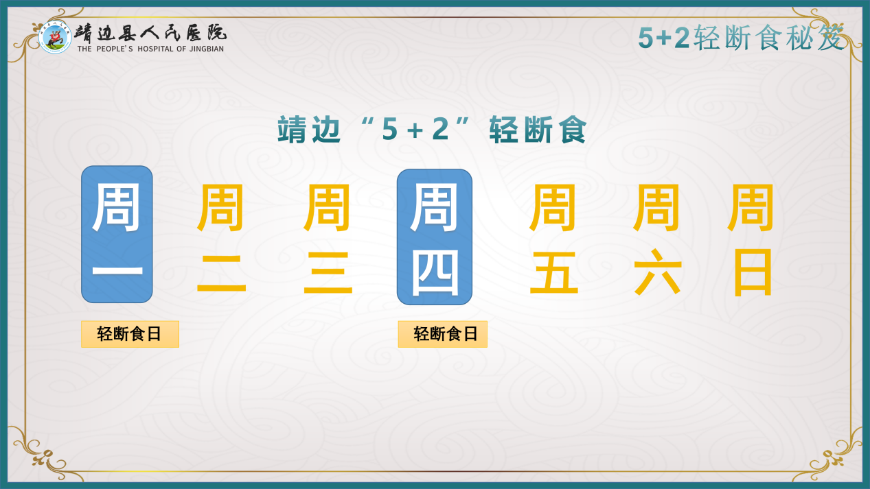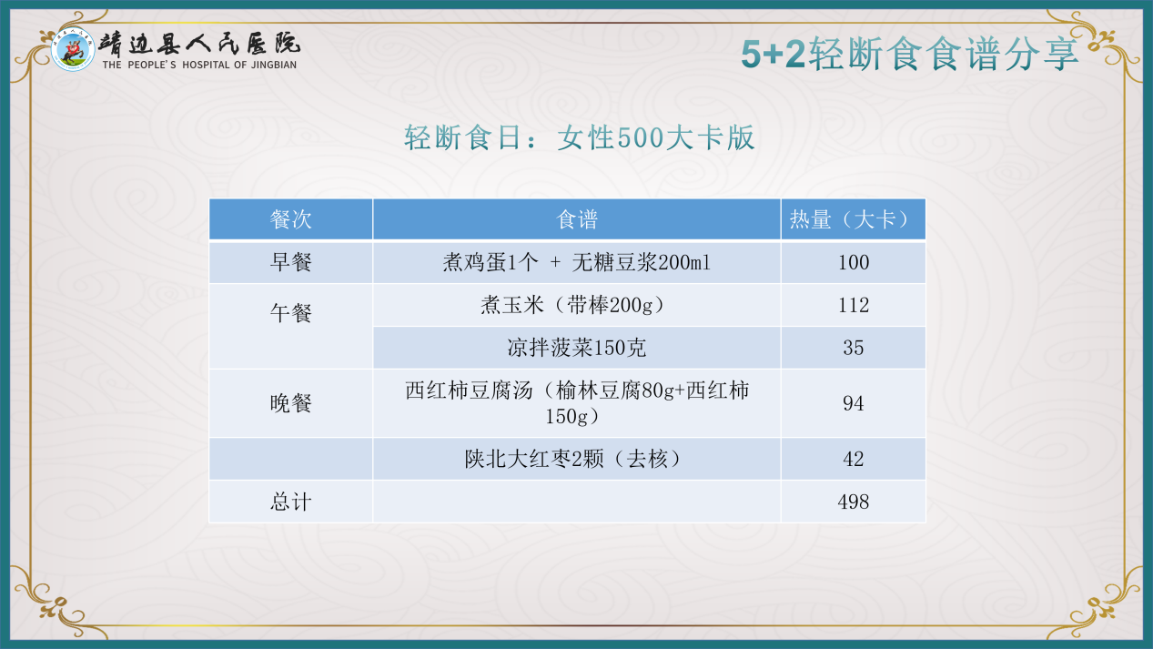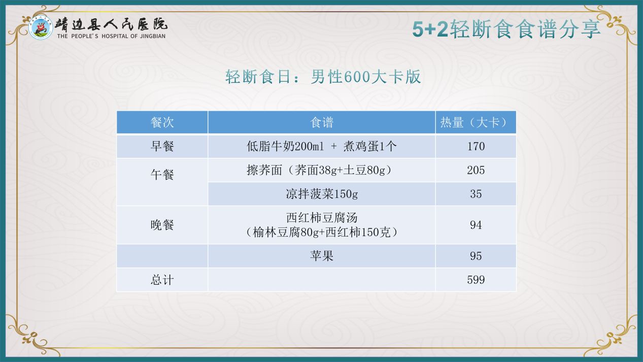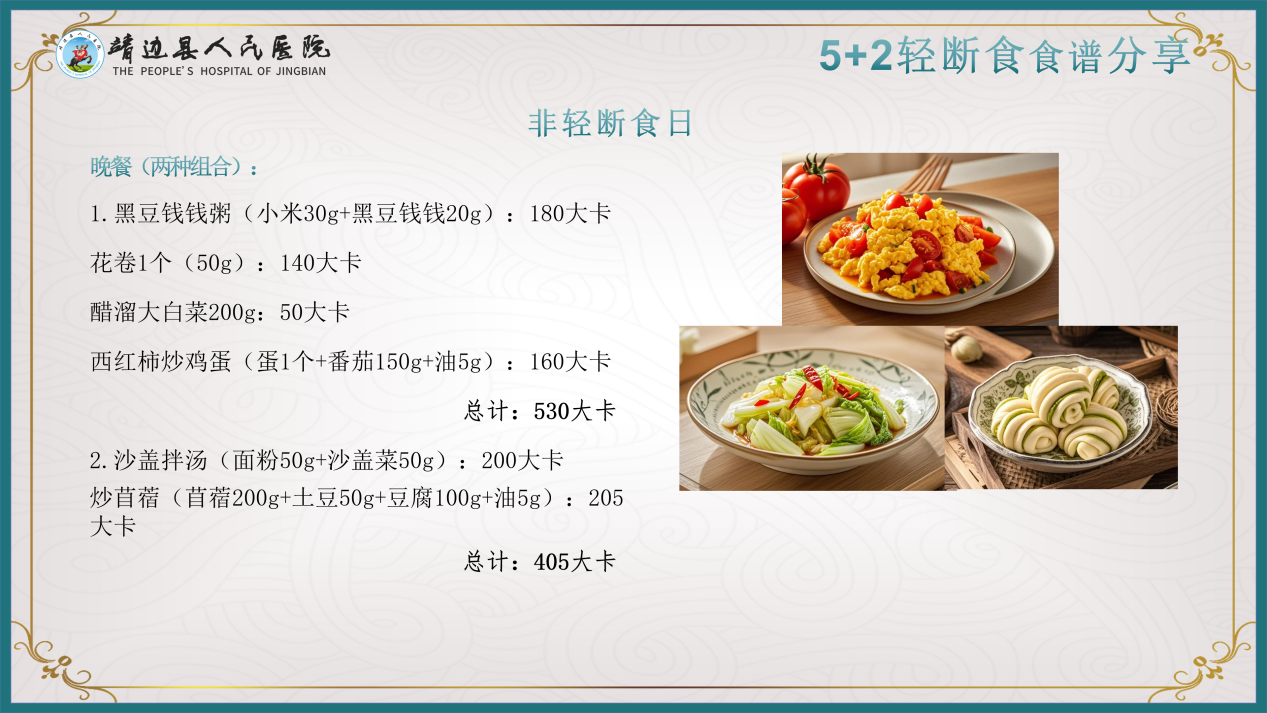 在 2025 年十四届全国人大三次会议记者会上,国家卫健委主任雷海潮直言道,并宣布持续推进“体重管理年”三年行动,呼吁全社会共同参与体重管理,“减重”已成为高频健康热词。靖边县人民医院特推出黄土坡上的科学瘦身法,靖边版5+2轻断食——家常饭菜也能瘦。