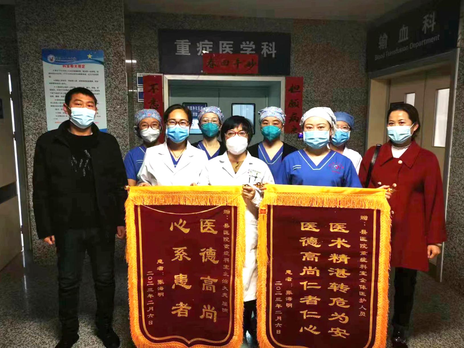 2023年2月6日患者家属为重症医学科屈楠大夫及全体医护人员送来感谢锦旗