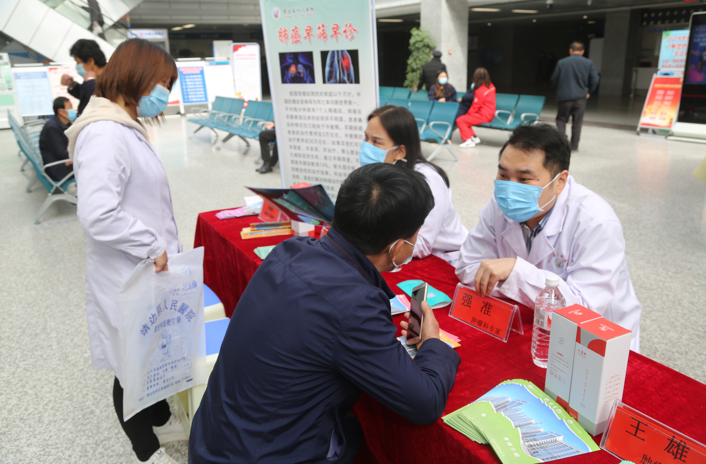 在第27个全国肿瘤防治宣传周活动期间,我院肿瘤科在门诊楼一楼候诊大厅开展义诊活动,为广大群众进行免费义诊和宣教科普。肿瘤科主任王雄,副主任冯学军,陕西省肿瘤医院强准教授以及医护人员耐心地为前来咨询的患者及家属进行免费诊断、测量血压等项目,详细的解答群众咨询的问题,并通过发放各种肿瘤疾病防治宣传手册、现场咨询、专家义诊、线上科普等方式宣传肿瘤预防知识,同时为前来咨询的患者及家属发放了小礼品。此次义诊活动,旨在让更多的人了解癌症、科学认识癌症,引导他们走出癌症误区,及早发现、治疗癌症,有效降低癌患死亡率。帮助广大市民提高肿瘤预防知识、倡导健康的生活、保持积极乐观的生活态度。