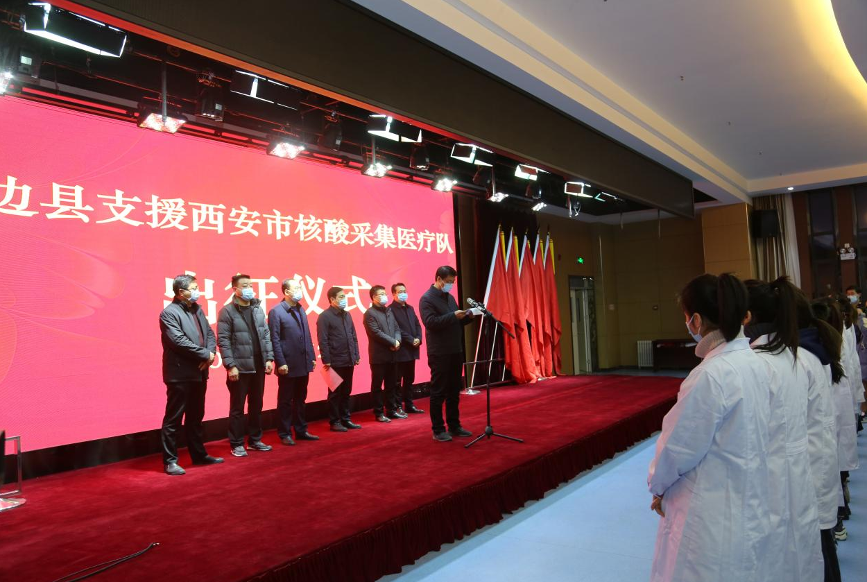 12月20日,我县支援西安市核酸采集医疗队出征仪式在我院会议中心举行,县委常委、常务副县长张文祥出席并讲话。按照县联防联控办统一安排部署支援西安核酸采集的通知后,我院党委高度重视,迅速响应疫情防控要求,组织20名医护人员赶赴西安共筑抗击疫情的坚强堡垒。院党委发出通知后,医护人员挺身而出,主动请缨,要求前往的人员争先恐后。大家舍小家顾大家的举动,充分体现了靖医人敢担当、肯奉献的精神。我院现有25名医务人员在西安、延安、榆林等地开展核酸采集及检测工作。同时我院还召集储备了第二梯队人员,支援省内疫情防控工作。