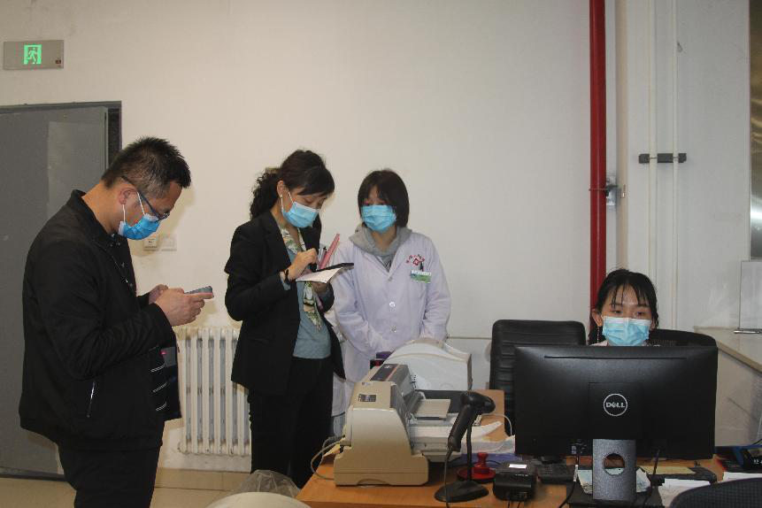图为:检查组在收费室进行督导检查