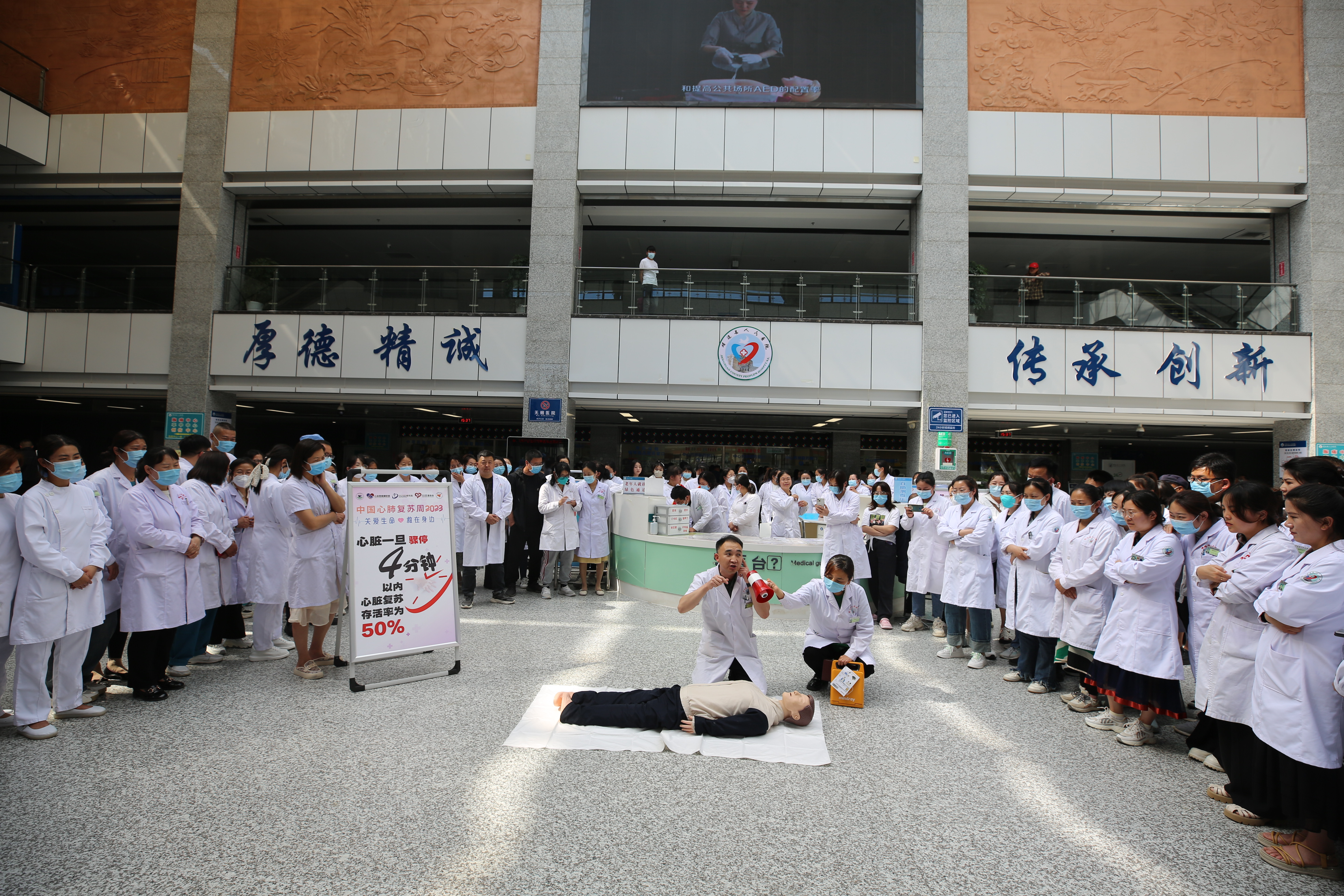 为积极响应“中国心肺复苏周”主题号召,引起社会各界对心脏骤停的重视,呼吁全民学习CPR-D(心肺复苏+心脏除颤),实现自救互救,由我院评审评价办组织,多科室协作,对门诊医技、窗口科室、河东院区工作人以及就诊群众开展“心肺复苏教学”主题宣教科普活动。我院还组织医务人员走进校园、老年大学、治沙基地、长庆基地开展科普宣教。