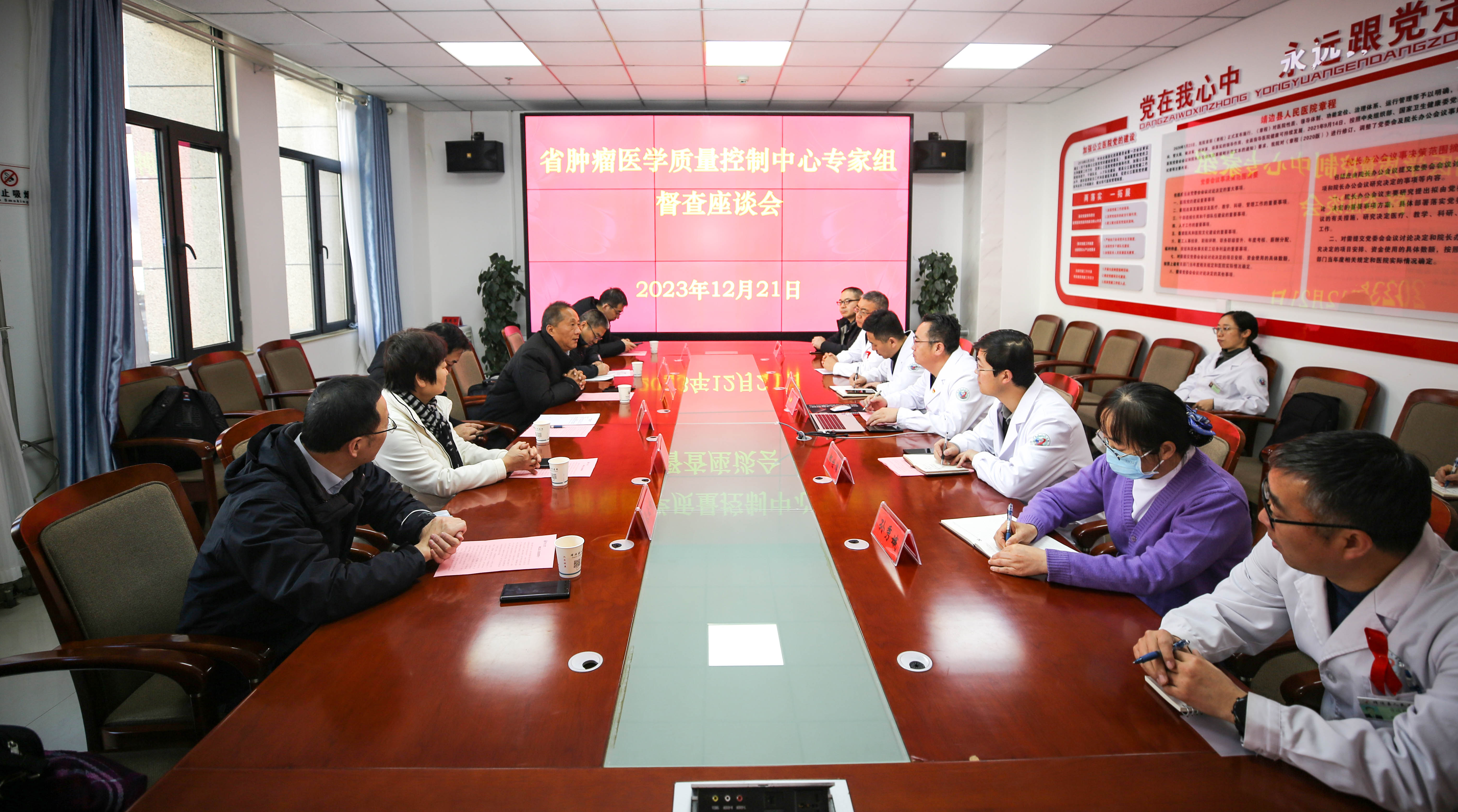 2023年12月21日,陕西省肿瘤医学质控中心史玉民、陈晓泉、龙海生、刘秋芳、张云峰等专家一行莅临我院督导检查肿瘤医疗质量和相关规范培训工作。我院副院长王雄、党委专职副书记郝世雄及相关科室负责人参加座谈会。会议由副院长王雄主持。