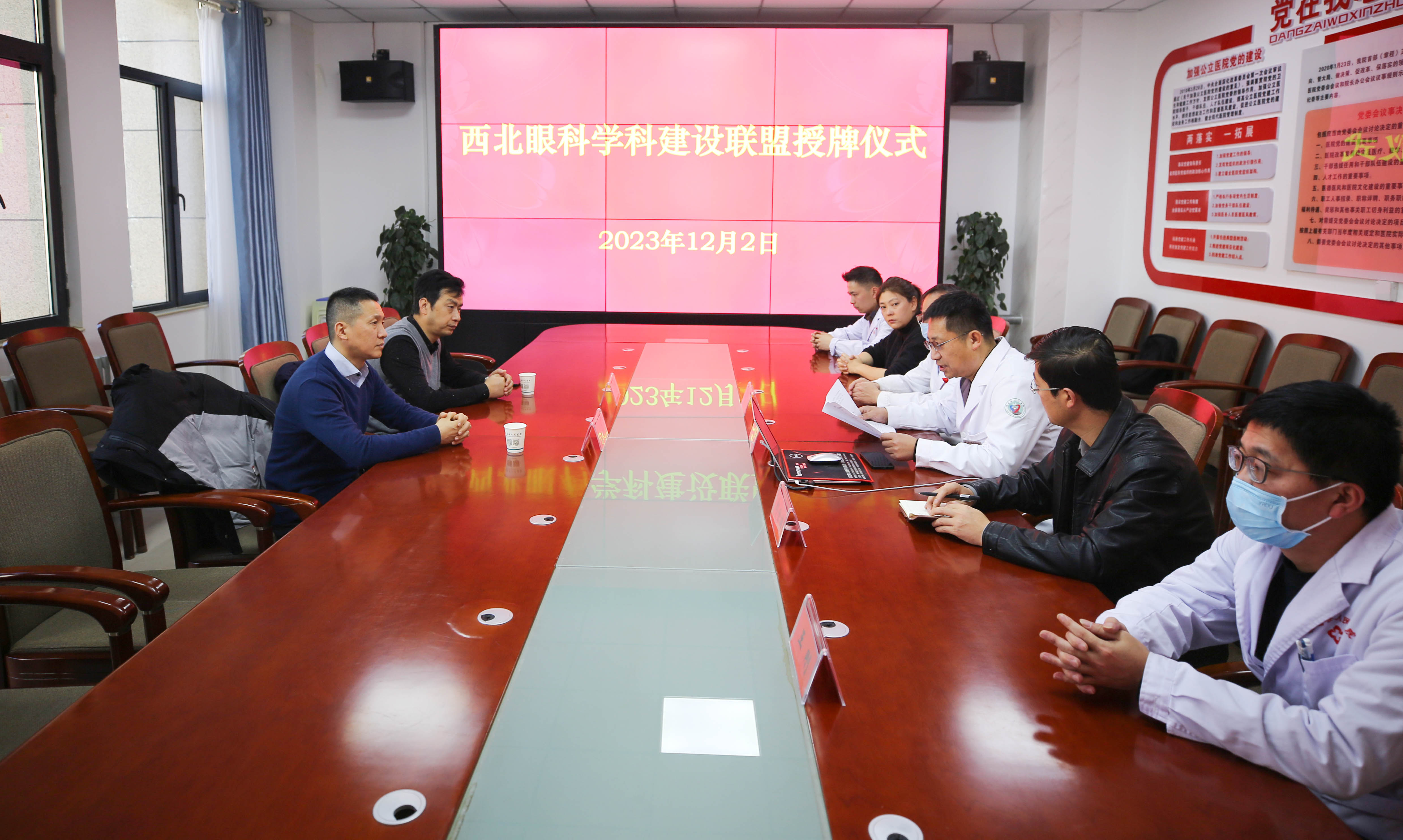 2023年12月2日,西安中心医院眼科主任杜兆江、副主任杨格强一行莅临我院开展西北眼科联盟授牌和业务指导。我院副院长姬向兵、党委专职副书记郝世雄、院长助理白治东及相关科室负责人参加会议。