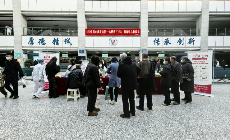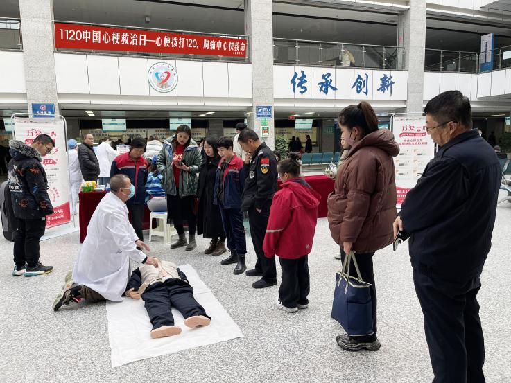 在医院门诊大厅,心血管内科医务人员为就诊群众免费测量血压、血糖,提供健康咨询,并向群众普及了徒手心肺复苏流程,让群众对这一重要的急救操作有了更清晰的认识。