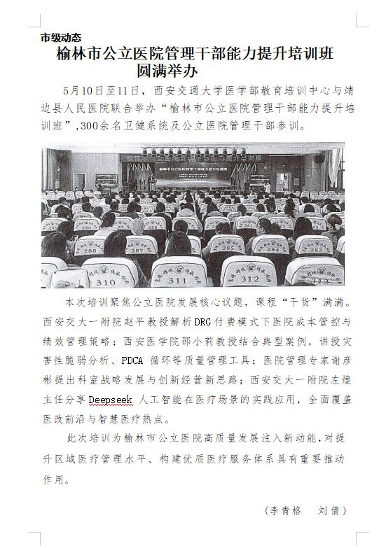 2025年5月10至11日,我院与西安交通大学医学部教育培训中心联合举办的“榆林市公立医院管理干部能力提升培训班”信息被榆林市公立医院改革发展中心《医改信息》简报转载。