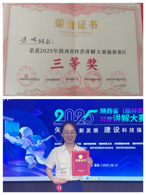 6月12日,由榆林市科技局、市教育局、市总工会、团市委、市科协联合举办的2025年陕西省科普讲解大赛(榆林赛区)落下帷幕。我院口腔中心医师冯晓凭借科普作品《我命由我不由天——牙齿健康您说了算》,从众多参赛者中脱颖而出,荣获大赛三等奖,展现了基层医疗工作者的科普传播能力。