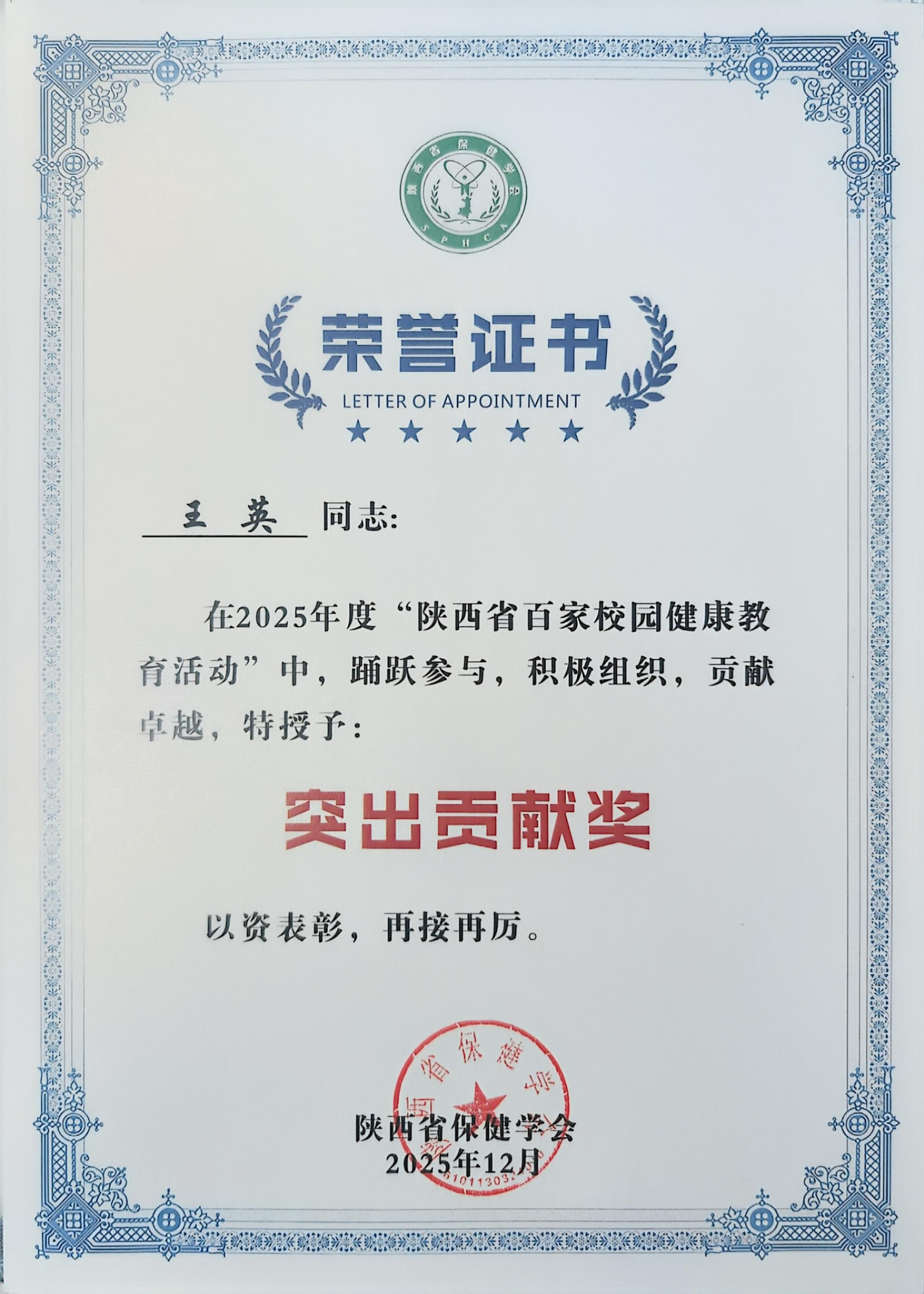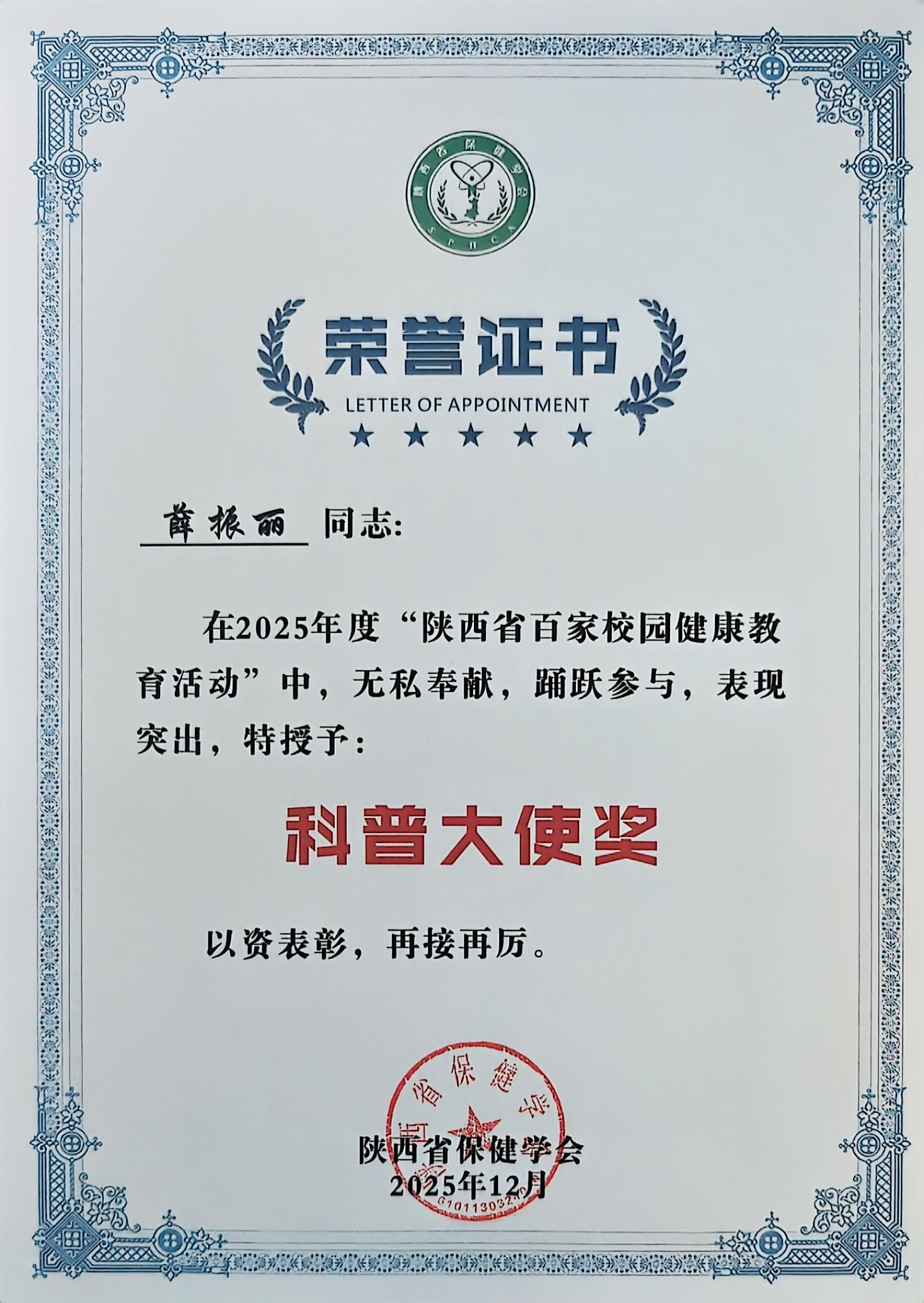 12月13日,由陕西省保健学会主办、陕西省保健学会学校卫生与健康专委会承办的“2025年陕西省保健学会学校卫生与健康专委会学术年会暨校园健康科普教育活动总结表彰会”在西安隆重举行。大会对在2025年度“陕西省百场校园健康教育”公益活动中表现突出的单位和个人进行了表彰。我院凭借在活动中的卓越组织和积极贡献,荣获“先进集体奖”,儿童保健科主任王英荣获“突出贡献奖”、薛振丽荣获“科普大使奖”。